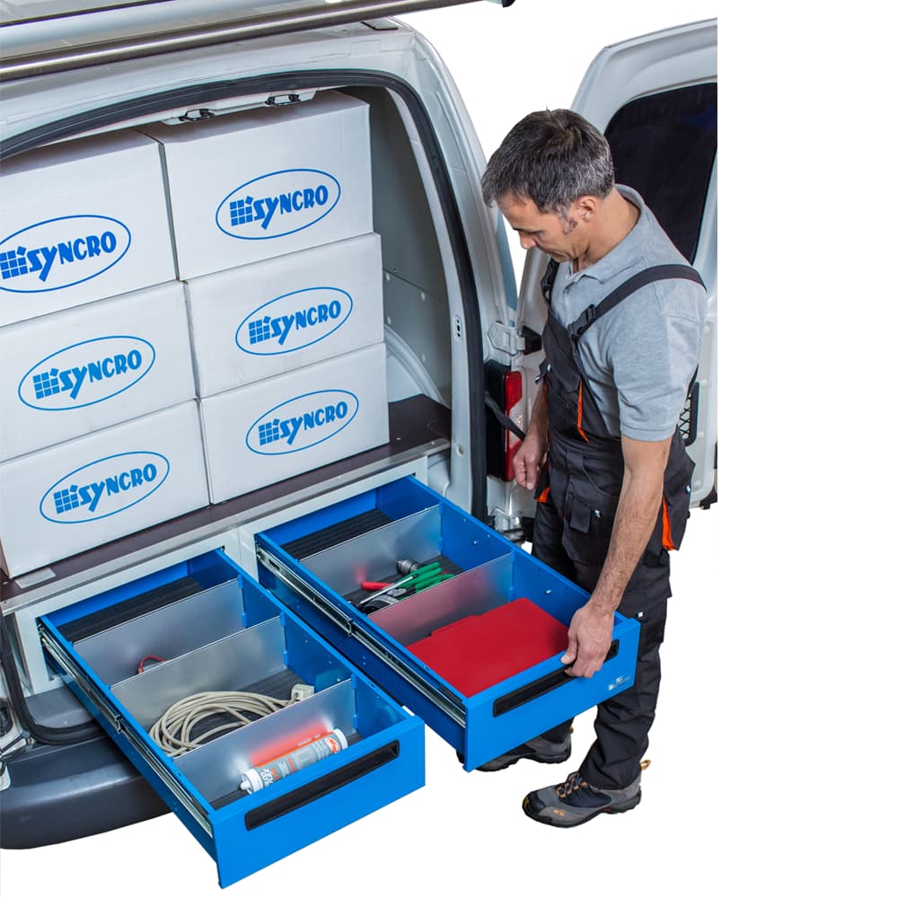 Всички модули и аксесоари са внимателно разработени. Голямо внимание се отделя на детайлите: всичките ви материали се съхраняват безопасно и подредено. Благодарение на богатата и модулна гама от обзавеждане за ванове, в Syncro България ще намерите правилното решение за всичките си нужди и за всеки ван.